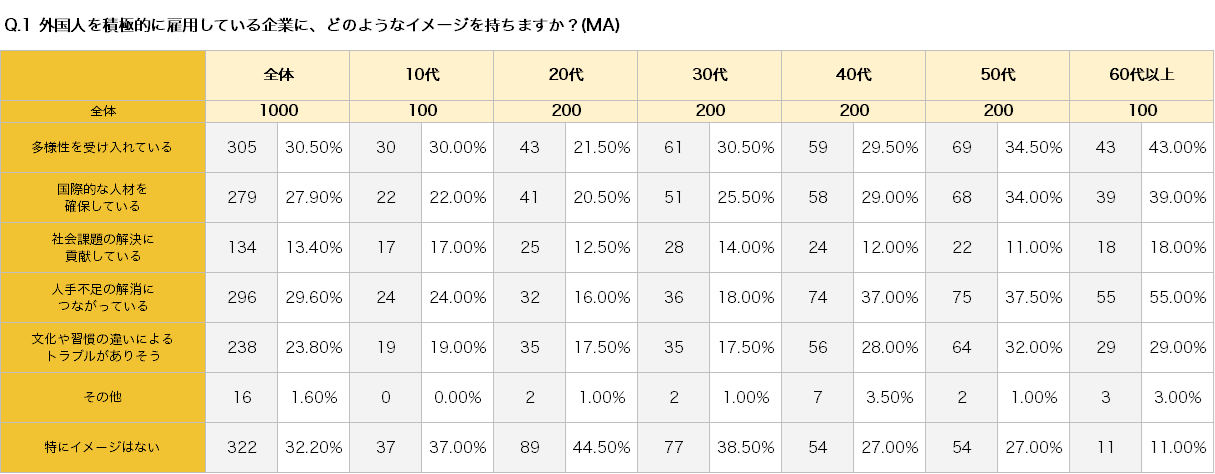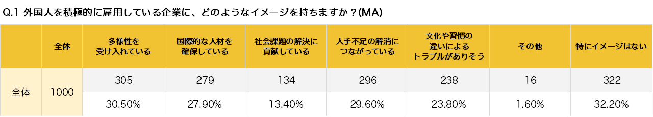 Q1. 外国人を積極的に雇用している企業に、どのようなイメージを持ちますか?(MA)