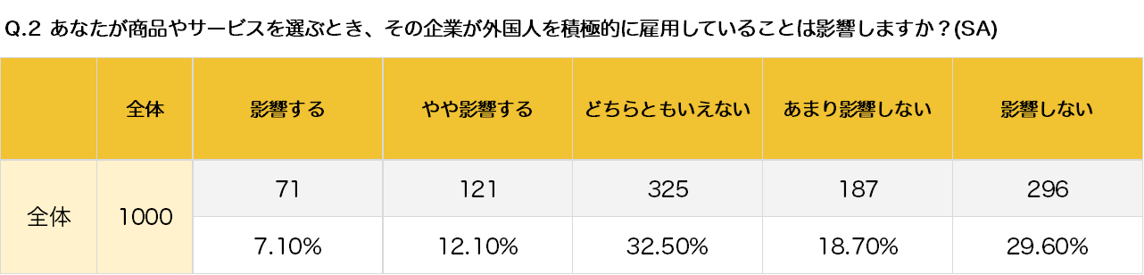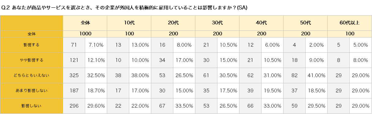 Q2.あなたが商品やサービスを選ぶとき、その企業が外国人を積極的に雇用していることは影響しますか?(SA)
