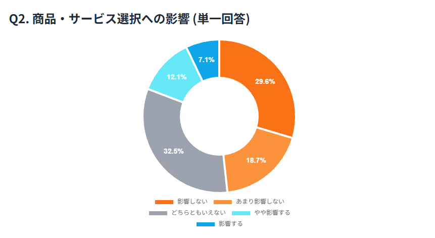 - 若年層(特に20代):企業の方針への関心は薄い(「特にイメージはない」が最多)が、商品選択時にポジティブな評判に影響される割合は最も高い。普段は無関心でも、良いイメージが伝われば購買を後押しする可能性を秘めている。