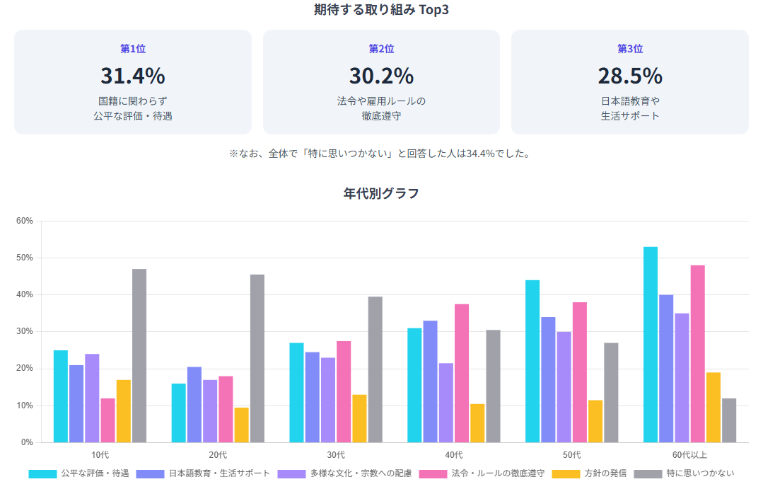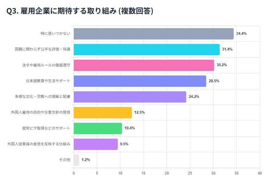 企業に最も期待する取り組みは「国籍に関わらず公平な評価・待遇」(31.4%) や「法令や雇用ルールの徹底遵守」(30.2%) であり、雇用の基本原則を徹底する姿勢が求められているようです。
