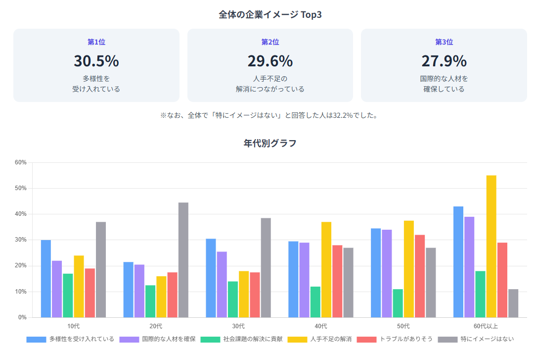 - 高年層(50代以上):「人手不足の解消」という実利的な側面を理解しつつ、企業に対して法令遵守や公平な待遇といった社会的責任を厳しく求めている。