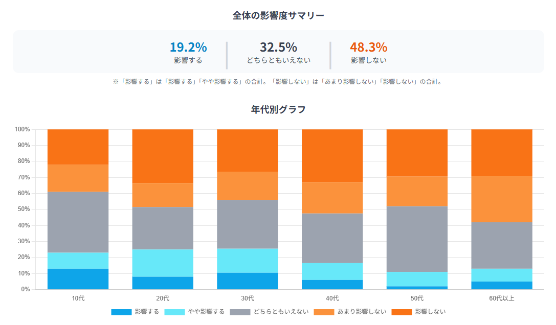 「どちらともいえない」「あまり影響しない」「影響しない」の合計が80.8%を占め、大多数の消費者にとって、企業の外国人雇用方針が直接的な購買行動に結びつくことは稀であると言える。