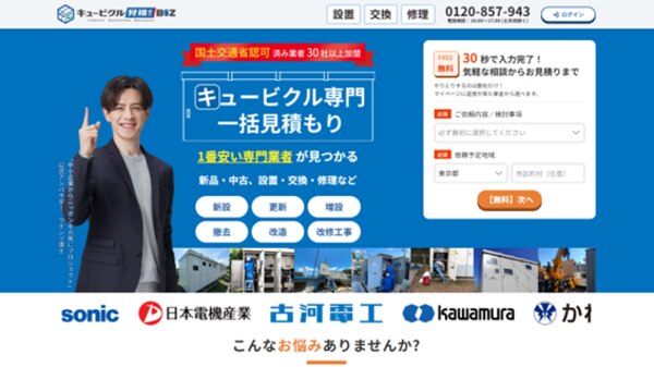 キュービクル見積もりBIZは、キュービクルソリューションズ株式会社が運営するキュービクル(高圧受電設備)の新設・交換・修理などに対応する専門業者を一括で比較・見積もりできるマッチングサイトです。